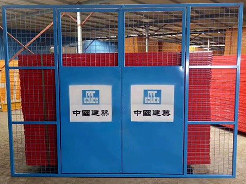 2.門面優(yōu)點:門面采用小孔鋼板網(wǎng)或電焊網(wǎng)片與鋼板組合構(gòu)成。一方面可以防止等候人員伸手開門,又便于人貨電梯操作人員觀察樓內(nèi)情況,利于樓內(nèi)外雙方工作人員溝通交流。高強冷軋鋼板同時也是小型汽車普遍采用的材料,可以抗擊300kg以上的沖擊力。并且噴涂警示語和擋腳警示線,對工地文明施工形象顯著提升。